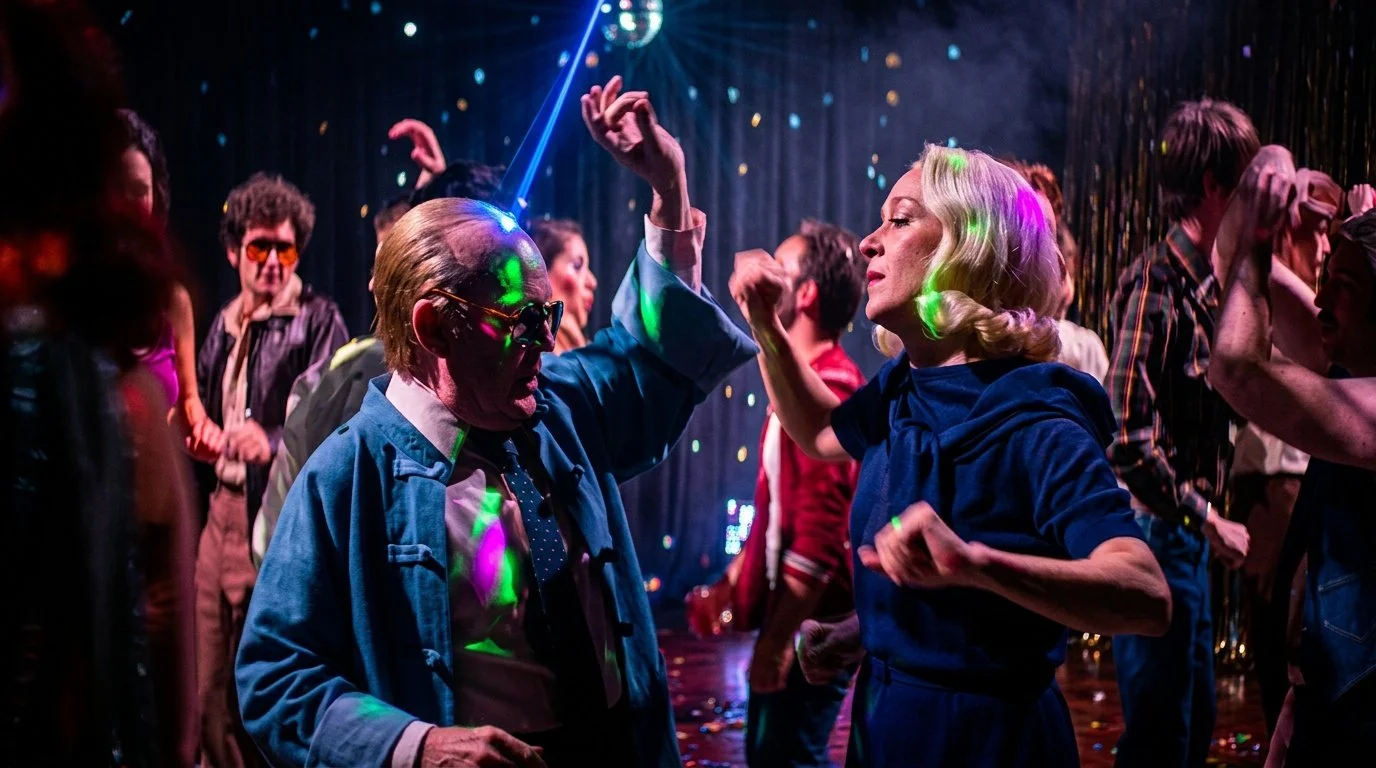 Working under Van Sant’s direction with Tom Hollander and Chloë Sevigny, Michaeljon crafted a moment that felt deliberately out of step with the pulsing disco era around them, isolating their movement as something awkward, intimate, and distinctly of another time.